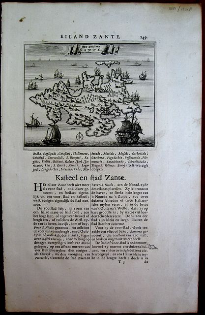 Copper engraved map. set on page of text in Dutch from Olfert Dapper's "Beschryving van Morea" 1688 Dark impression of copper engraved map with wide margins; single page; folio; within text, ; page no 149. text to verso.