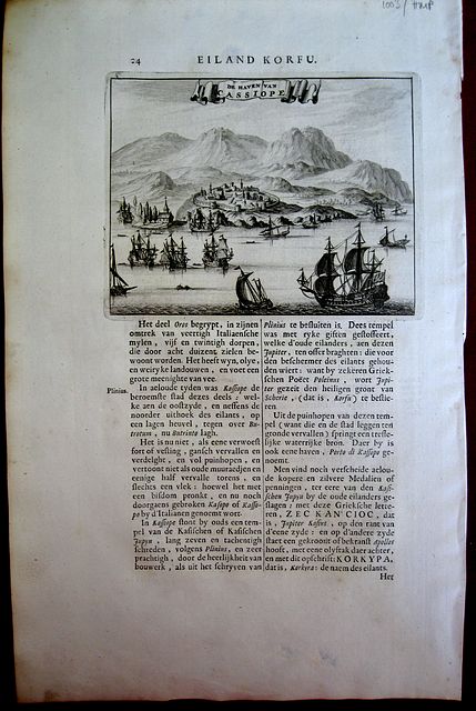 Copper engraved view of Cassiope in northern Kerkyra/Corfu, set on page of text, in Dutch[ page 24]. Single page, folio, Text on verso. From Olfert Dapper's" Beschryving van Morea" 1688. Dark impression. wide margins.