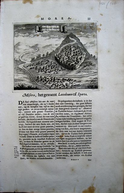 Dapper, Olfert "Mistra ou Sparte" "Mistra, het gewaent Lacedemon of Sparta" Amsterdam Wolfgangh, Waesbergen, Boom. Someren en Goethals 1688 Company: Bryan, Mary Louise.