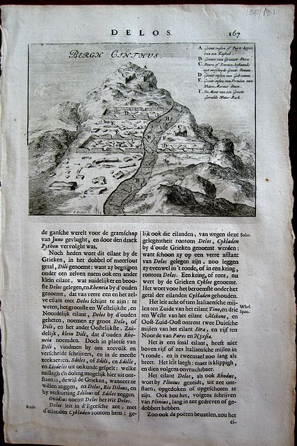 Copper engraved view of the Bergh Canthus. Delos Set in a page of Dutch text [page167] From Olfert Dapper's" Naukeurige Beschryving der Eilanden in de Archipel der Middelantsche Zee"1688. Single page; folio. Text to verso. Wide margins. Very light damp staining to lower margin