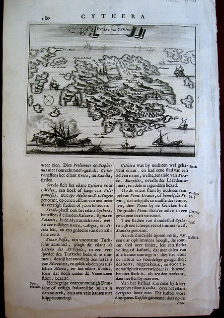 Copper engraved map of Kythera, set in apage of Dutch text [page 180] From Olfert Dapper's" Naukeurige Beschryving der Eilanden in de Archipel der Middelantsche Zee"1688. folio. Single page, folio, text to verso. Dark impression. good margins, light dampstaining to lower margin just touching last line of text.