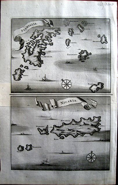 2 Copper engraved maps of Astypalia & Ikaria on one page. From Olfert Dapper's" Naukeurige Beschryving der Eilanden in de Archipel der Middelantsche Zee"1688. Single page, folio, verso, blank. Dark impression with good margins. old reinforcement to verso between the 2 maps.