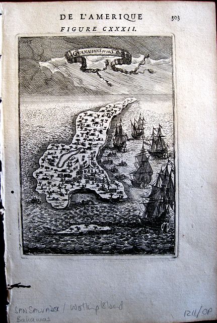 Copper engraved map of Guanahani Island called by Columbus San Salvador in the Bahamas, from Mallet's "Description de l'Univers" 1st edition. Text to verso. Guanihani where Columbus first landed in the New World has been identified as modern day San Salvador formerly Watlings island in the Lucyan Archipelago of the Bahamas, however there are various other candidates. within the Archipelago most notably Samana Cay. 65 miles south east of San Salvador. Dark impression; worm hole [2mm] and small worm track[15mm] to inner blank margin.