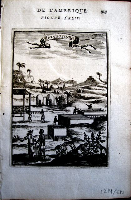 Copper engraved illustration of Indigo cultivation and preparation in the Caribbean, from Mallet's "Description de l'Univers" 1st edition. Text to verso. Dark impression; worm hole [2mm] to inner blank margin.