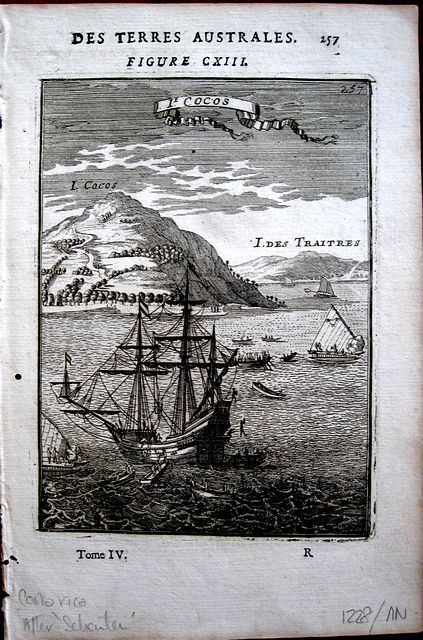 Copper engraved view of Cocos island; Traitors island in the background, from Mallet's "Description de l'Univers" 1st edition. Text to verso. Dark impression; 2 worm holes [2mm] to inner blank margin.