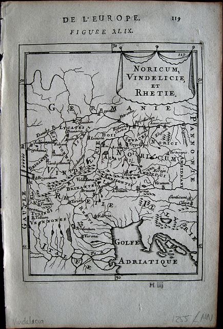Copper engraved maps of the Roman provinces of Noricum, Vindielicia & Rhetia [modern Austria. Tyrol and Switzerland], from Mallet's "Description de l'Univers" 1st edition. Text to verso. Dark impressions.