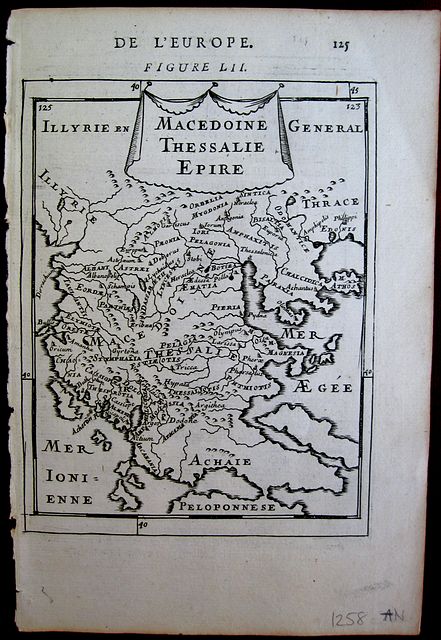 Copper engraved map of Macedonia. Thessaly and Epirus, from Mallet's "Description de l'Univers" 1st edition. Text to verso. Dark impression; inner left margin 5mm