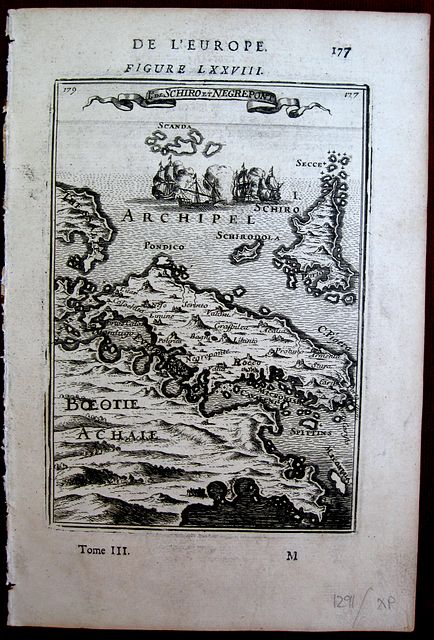 Copper engraved map of Euboea/ Euboia [Negroponte] and Skyros off the coast of Beotia, from Mallet's "Description de l'Univers" 1st edition. Text to verso. Dark impression.