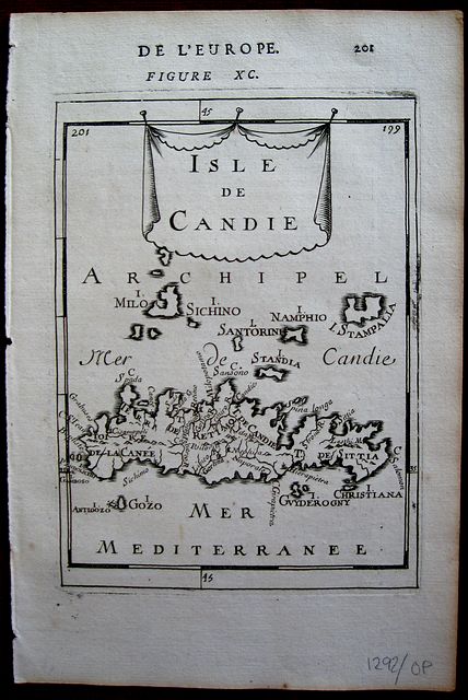 Copper engraved map of Crete [ callled Candia by the Venetians] with Milos, Sikino Santorini etc to the North, from Mallet's "Description de l'Univers" 1st edition. Text to verso. Dark impression.