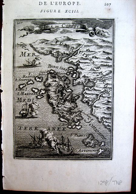 Copper engraved map of Kerkyra/ Corfu with Paxos and the coast of Epirus. from Mallet's "Description de l'Univers" 1st edition. Text to verso. Dark impression.