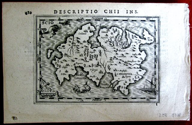 Copper engraved map ofChios, by Hondius from Petrus Bertius :"Tabularum geographicum contractarum libri septum. " Decorative cartouche. sea monster and tireme. Latin text to verso describing the succeeding map. Dark impression. Light dampstaining to lower, blank, margin