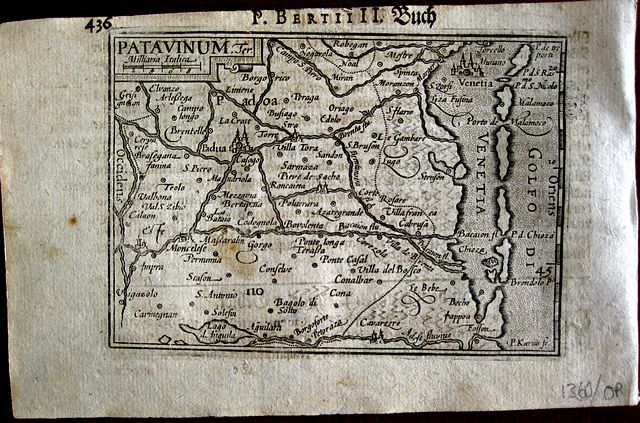 Copper engraved map of Padova/Padua and surrounding area, to the gulf of Venice. from " Petri Bertii Geographischer eyn oder zusammengezogner tabeln fünff untershiedliche bücher". German text to verso. Good impression, light toning. Printed slightly crooked on the page; upper margin short [4-7mm]. Slight showthrough of text from verso.