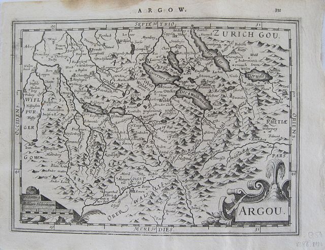 Copper engraved map of Argow, Switzerland, from" Gerardi Mercatoris, Atlas sive Cosmographicae Meditationes de Fabrica mundi et fabricati figura, "Latin text to verso. Good impression; minor spotting; damp stain to upper margin.