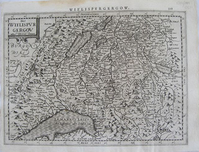 Copper engraved map of Wiflispurgergow, Switzerland, from" Gerardi Mercatoris, Atlas sive Cosmographicae Meditationes de Fabrica mundi et fabricati figura, "Latin text to verso. Dark impression;minor spotting; spot on Lake Leman: damp stain to upper margin. Left inner blank margin short 4-5mm.