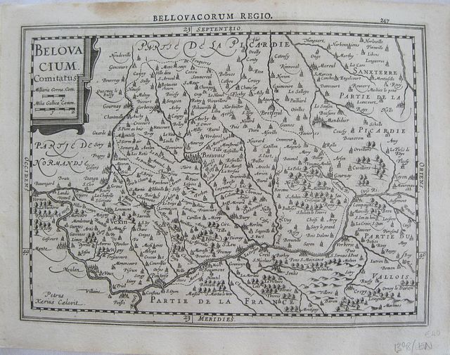 Copper engraved map of Beauvais, France, from" Gerardi Mercatoris, Atlas sive Cosmographicae Meditationes de Fabrica mundi et fabricati figura, "Latin text to verso. Dark impression;damp stain to upper margin. Heading "Bellovacorum Regio" just entering plate mark.