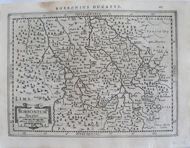 Copper engraved map of Bourbonnais, Central France, from" Gerardi Mercatoris, Atlas sive Cosmographicae Meditationes de Fabrica mundi et fabricati figura, "Latin text to verso. Dark impression; dark damp stain to upper margin.