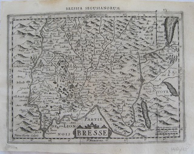 Copper engraved map of Bresse, France, . from" Gerardi Mercatoris, Atlas sive Cosmographicae Meditationes de Fabrica mundi et fabricati figura, "Latin text to verso. Dark impression; damp stain to upper margin. Printers ink line running down the map on the right side.