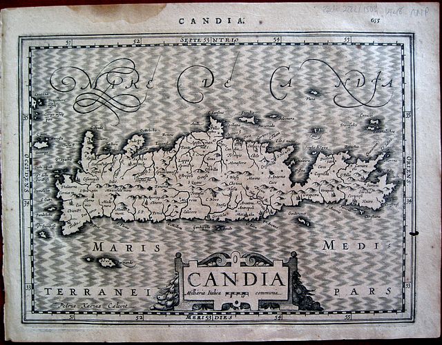 Copper engraved map of Crete/ Candia, from" Gerardi Mercatoris, Atlas sive Cosmographicae Meditationes de Fabrica mundi et fabricati figura, "Latin text to verso. Dark impression; evenly toned; some dampstaining to blank margins; dark damp stain to upper margin; some spotting; wormtrack 6mm. to right scale.