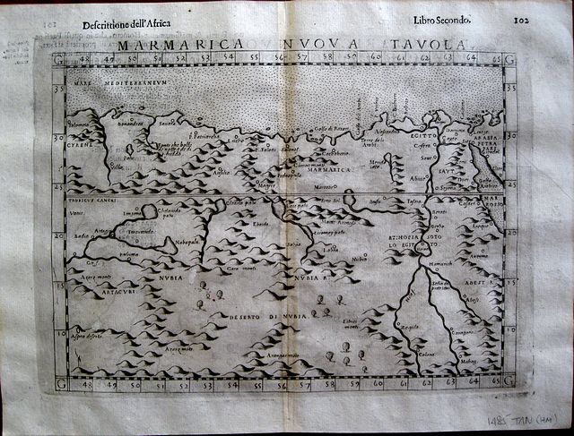 Copper engraved map of "Marmarica", part of north Africa between Cyrene and the Nile, from the 4th edition of Ruscelli's " Geografio di Claudio Tolemeo, Alessandrio. . ", edited and augmented by Rosaccio. Italian text to verso. 4to. Dark impression; some show through of text from verso; 2 small paper flaws to engraved area.