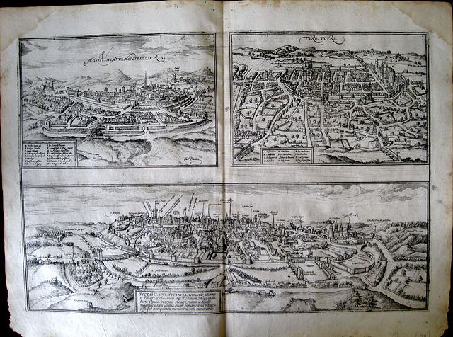 3 copper engraved views of Montpellier, Tours & Poitiers from the first volume of Braun & Hogenberg's "Civitas Orbis Terrarum. " Latin text to verso. First state. 3 views on 1 plate Good impression; a few spots and stains to blank margins.