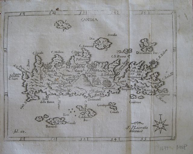 Copper engraved map of Crete, from "L'Egeo redivivo , o' sia choragraphia dell' Archipelago". Signed in the plate F. Placentia. Verso blank. Good impression but slightly faint to upper scale; some slight toning: folded.