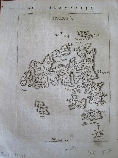 Copper engraved map of Astypalaia and the small surrounding islands from "L'Egeo redivivo , o' sia choragraphia dell' Archipelago". Text to verso. Good impression; slight show through of text and decorative tailpiece from verso; spotting to lower right corner.