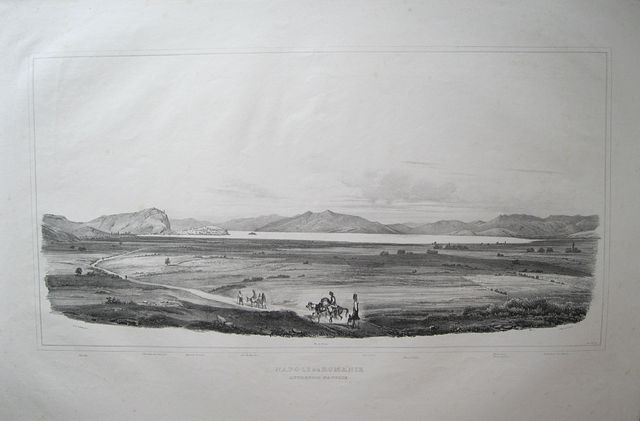 Black & white lithograph of Nafplion and the approach across the plain of Argos from Stackelberg's