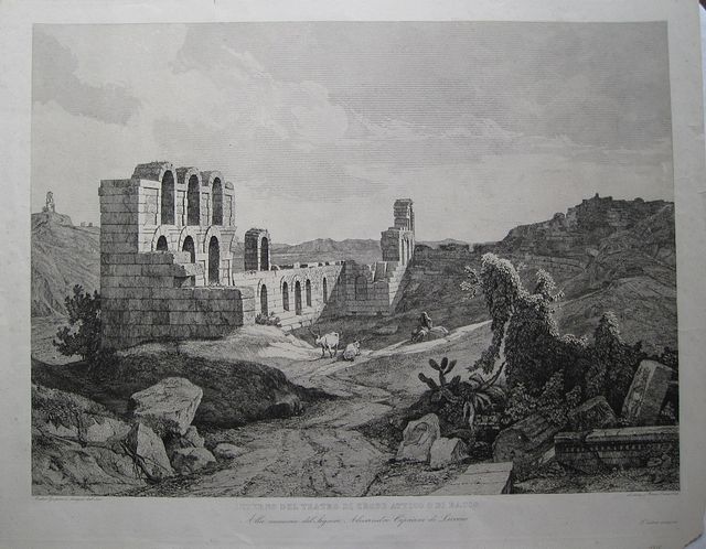 Copper engraving of the Herodeion or Theatre of Herodes Atticus by Andrea Gasperini. Black & white; verso blank. Dedication to "Signor Alessandro Cipriani di Livorno, amatore e dislinto cultore di belle arti" with the artist's sincere friendship and gratiude.
