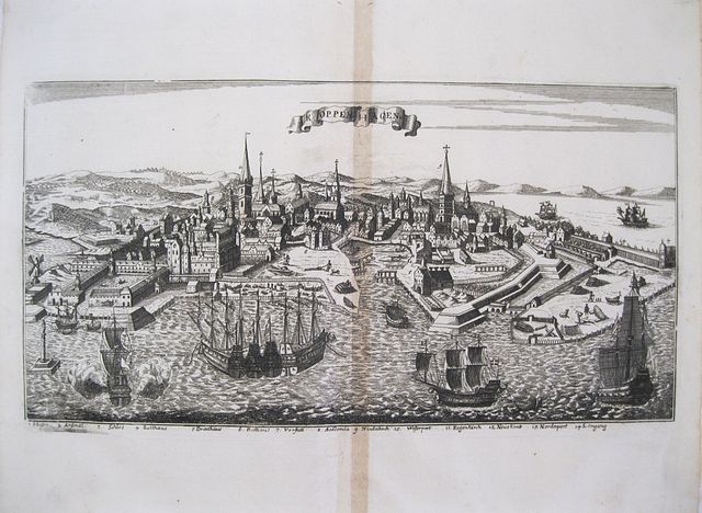Copper engraved view of Copenhagen from Johann Christoph WAGNER's " Delineatio provinciarum Pannoniae et imperii Turcici in oriente. Eine grundrichtige Beschreibung deß ganzen Aufgangs sonderlich aber deß hochlöblichen Königreichs Ungarn und der ganzen Türckey." by Jacob Koppmayer. The view shows the town and port with a number of large ships in the foreground. Key to important buildings below. Dark Impression; light even toning; browning to centre fold from guard glue; 2 tiny wormholes to upper blank margin.