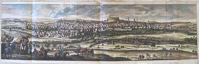 Long, folded, copper engraved panoramic view of Aleppo from "Reizen van Cornelis de Bruyn, door de Vermaardste Deelen van Klein Asia...."[ "Voyage au Levant"]. Modern colour; verso blankThe image is one of the largest of the former capital of Syria, showing the full extent of the city; the view is taken from the high ground looking down on the city. In the foreground a caravan arrives at the end of the Silk road. Dark impression; folded; 2 plates joined; one part toned due to paper quality; old repaired split to one fold; side margins close trimmed by binder.