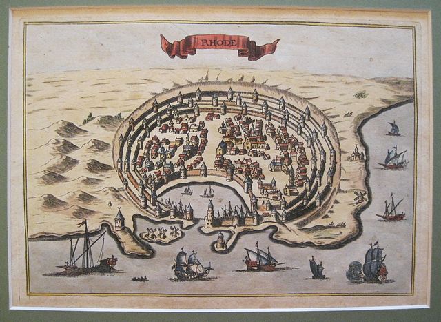 Decorative copper engraved view by Jacques Peeters of Rhodos city from "Description Des Principales des Villes. . . . " .Modern hand colour; verso blank Dark impression.