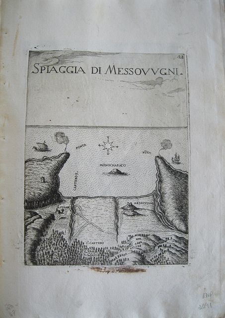 The view/ map shows the bay at Kateros just east of Candia city/ Iraklion; the bay named after the Byzantine General, Krateros, who in 824 AD landed on the beach with his ships in order to liberate Crete from the Saracens, but was defeated. On the vast bay, there are two settlements, Karteros and Amnisos. Amnisos was Minoan settlement, and the bay was the location of the ports of Knossos. Dark impression, on laid paper, soiling to blank margins; dampstain to right, blank margin.;ink? stain just outside plate at lower blank margin.