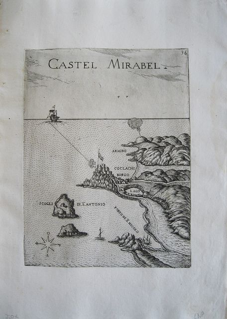 The view/ map shows the coast , the castle of Mirabel with the lake behind and the port of Agais Nicolaos. Dark impression, on laid paper; dampstain to left blank margin.