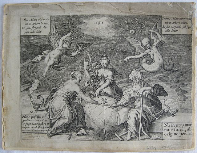 The engraving shows three female figures representing the fates of Greek Mythology: Clotho the spinner, spins the thread of life: Lachesis, the measurer, who choses the lot in life one will have and measures off how long it is to be and Atropos, she who cannot be turned, who at death with her shears cuts the thread of life. A terrifying, serpentine representation of original sin from Genesis prods the skein of life with a flaming arrow, and an angel pours sacramental wine on the flames whilst gazing to Heaven. Biblical texts to corners. Dark impression; soiled, worn and damaged to right edge; attached to modern end paper.