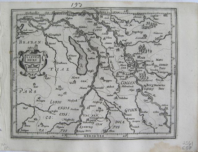Mercator Gerhard, Hondius Jodicus. Cleves and Meurs. "Cleve et Murs." Amsterdam, " Exusum in aedibus Jodici Hondij veneunt etiam apud Corneliu Nicolai. item apud Joannem Janssoniu Arnhemi." 1607 Company: Bryan, Mary Louise.