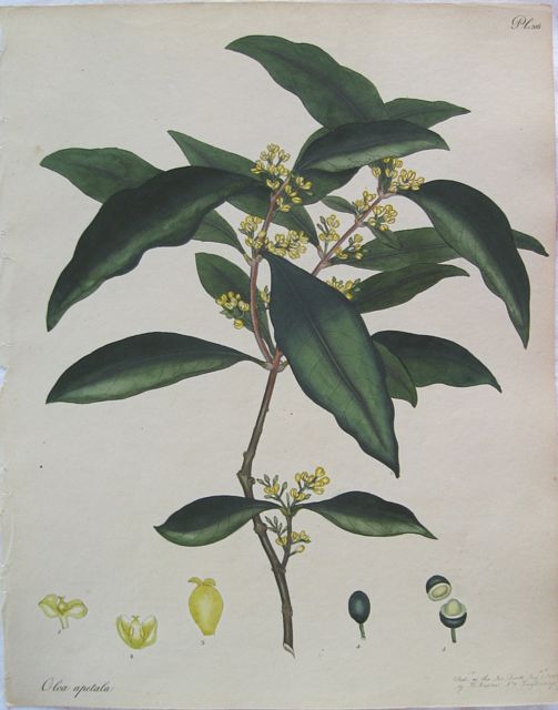 Original coloured engraving of the Petal-less Olive from Henry Andrew's "