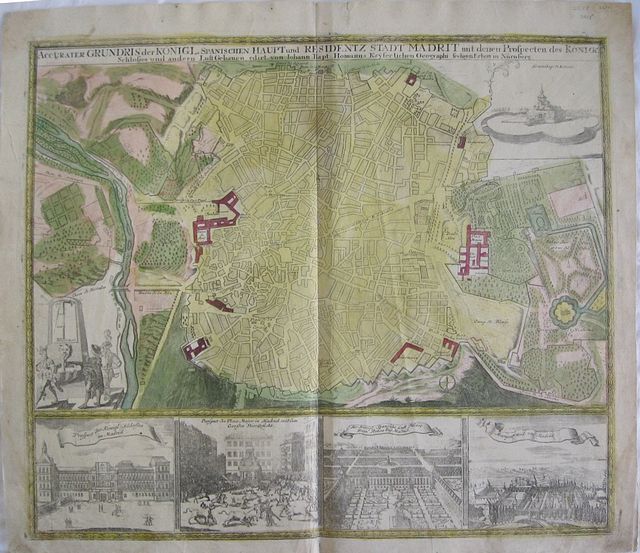 Accurater grundriß der Konigl.spanischen Haupt und Residentz Stadt Madrit mit denen Prospecten des Konige Schlosses und andern Lust Gubænen.." Nuremberg Homann, Johann Baptist. 1730