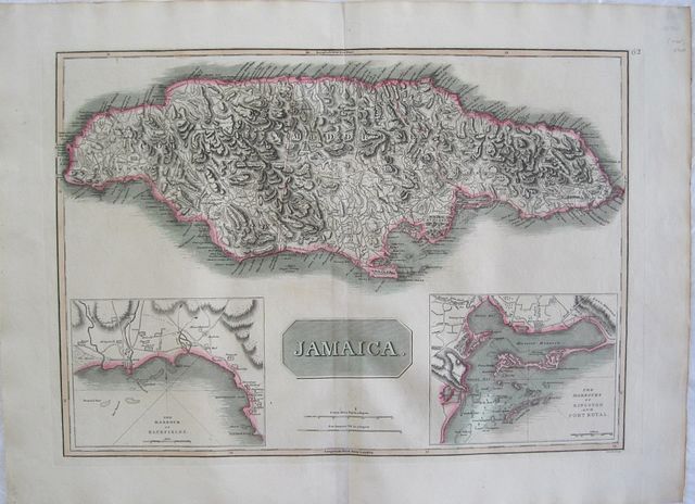 The large plate shows the island of Jamaica with inset maps, details of the bay of Bluefields in Westmoreland Parish and the harbour of Kingston showing the position of Port Royal on the Palisadoes.