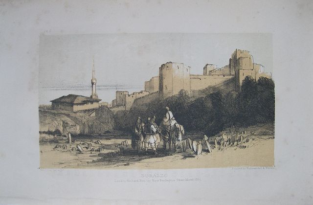 Tinted lithograph of Durazzo/ DurrësDurrës is the second largest city of Albania, from Edward Lear's " Journals of a Landscape Painter in Albania, Illyria &c." [ plate 8]