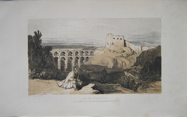 The diaries and paintings that resulted from this trip were published in 1851 in "Journal of a Landscape Painter in Greece and Albania". On his extensive journey from the latter months of 1848, the places he visited included Tirana, Shkodra, Durres, Kruja and Berat. Today, there is an art museum in Berat that bears Lear's name, a testament to the high esteem in which Albania holds the work of the artist, not to mention the effect his words and images had in demystifying their land and culture. Light soiling and foxing mainly to blank margins; lithographer's pinholes to corners of image as usual.