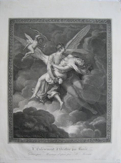 One of a suite of 2 prints by the prolific engraver Moreau le Jeune, (the other depicting Pygmaleon.} The image shows the winged Borreas carrying Oreithyia in his arms, into the clouds with Eros looking on. Surrounded by an engraved border.