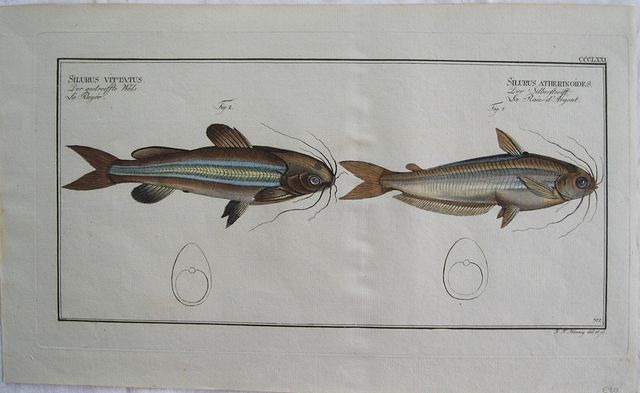 Copper engraving of the Striped Silure & the Silver Stripe from Bloch's "