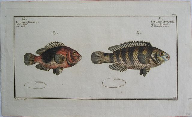 The Goldsinny & the Saddle. "Lutjanus Rupestris. Die Seekarausche. Le Carasfin de mer. " & " Lutjanus Ephippium. Der Sattel. Le Selle