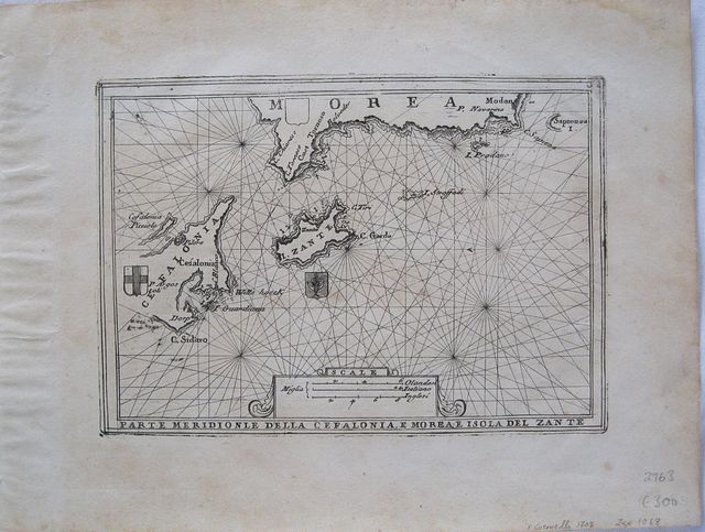 Copper engraved miniature sea chart showing part of Kefalonia the morea and the island of Zakynthos from CORONELLI's"