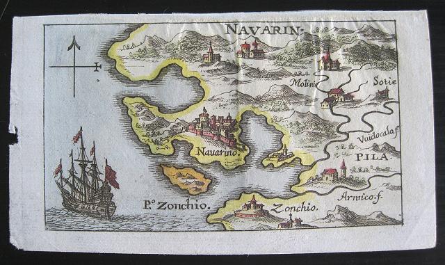 The map shows the area & position of Navarino, modern Pylos with the castle guarding the bay which a large ship is approaching. The map mentions three names the Franco Italian Porto Zonchio, a Greek one, Avarinos later shortened to Varinos or lengthened to Anavarinos which became Navarino in Italian and Navarin in French and Pila from Pylos its ancient name down to Byzantine times,. Good impression; modern hand colour; slight creasing; upper margin short due to binding; mounted.