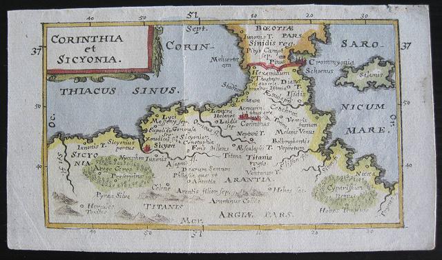The map shows Korinthia, Ancient Sicyonia and Isthmia, showing the korinthian ans Saronic gulfs with Salamis. Most of the names are in Latin. Good impression; modern hand colour; upper margin short due to binding; old ink numbers to borders.