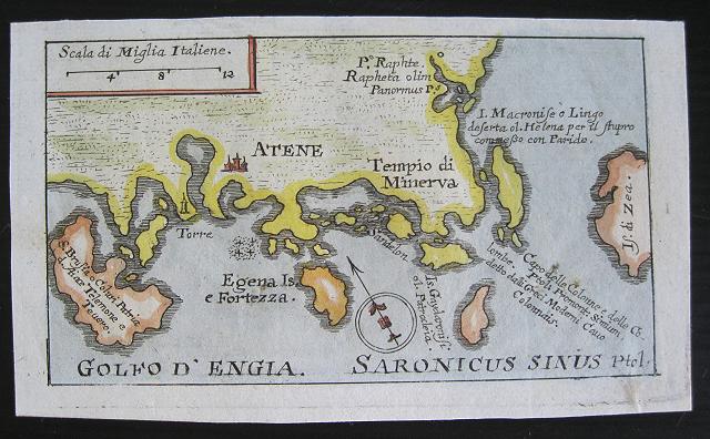 Extremely scarce small copper engraved map of Athens and surroundings, from Loschge's "Neue vermehrte Beschreibungder trflichen Halbinsel Morea mit den Angrezenten Inseln und Provinzen des Coronelli und andern Italianischen Schriften" Modern hand colour. The map shows the position of Athens on the gulf of Aegina; the location of the "Temple di Minerva "at Sunion and the near islands, Aegina Kea &c.. Good impression; modern hand colour.