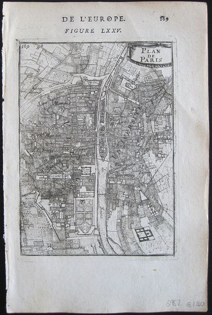 Copper engraved plan of Paris from Mallet's "Description de l'Univers" 1st edition. Text to verso. Dark impression, light toning, and slight soiling to right blank margin.