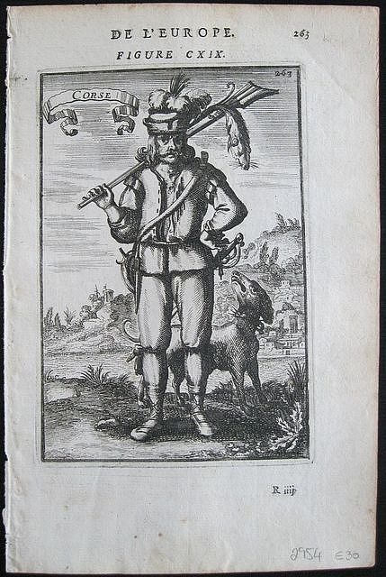 Copper engraved costume print of a Corsican hunter from Mallet's "Description de l'Univers" 1st edition. Text to verso. Dark impression, light toning;minor spotting to blank margins; crease to upper right corner.