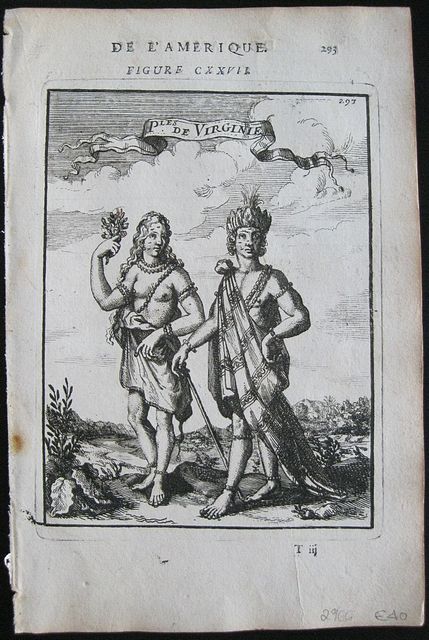 Copper engraved illustration of Native Virginians from Mallet's "Description de l'Univers" 1st edition. Text to verso. Dark impression; light toning; minor spotting left blank margin.
